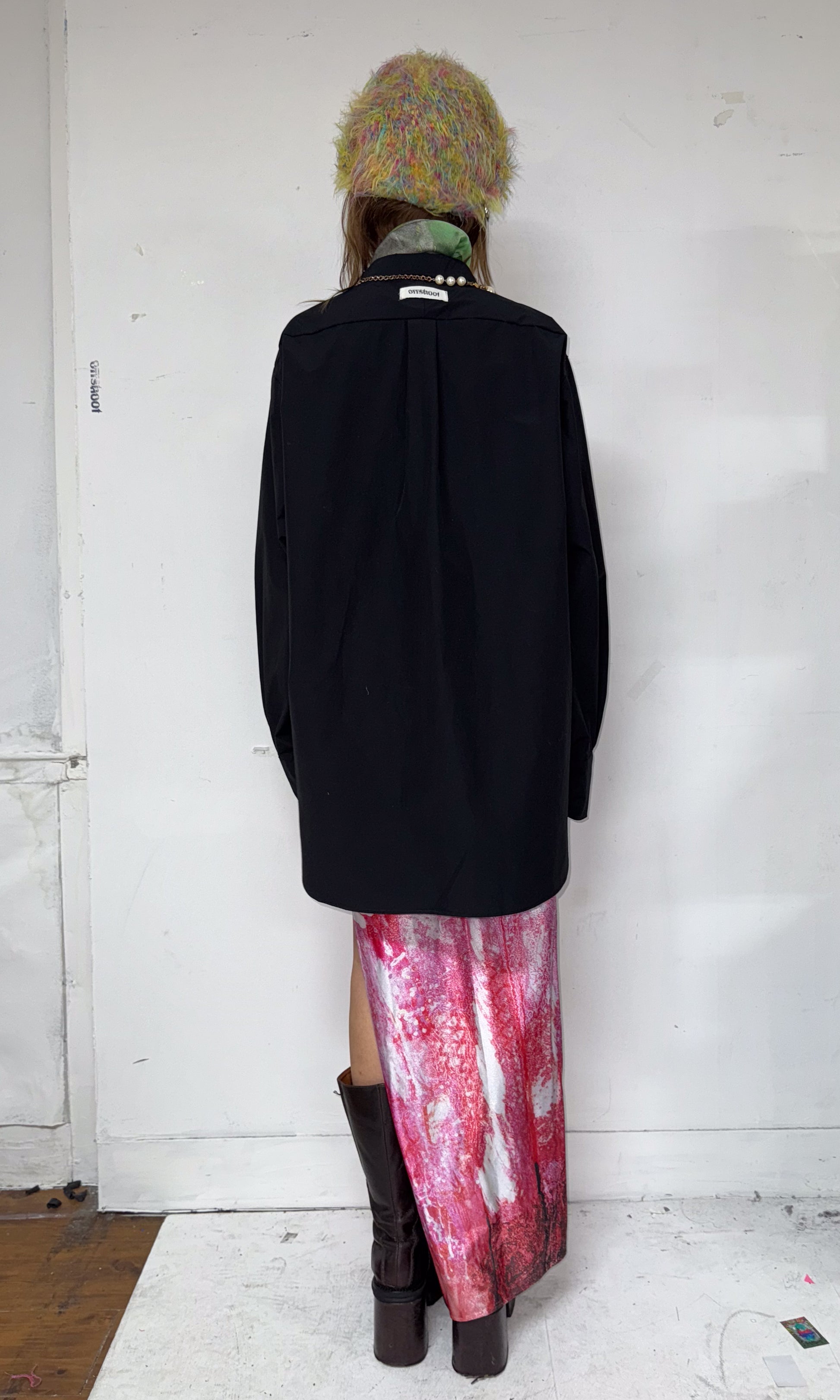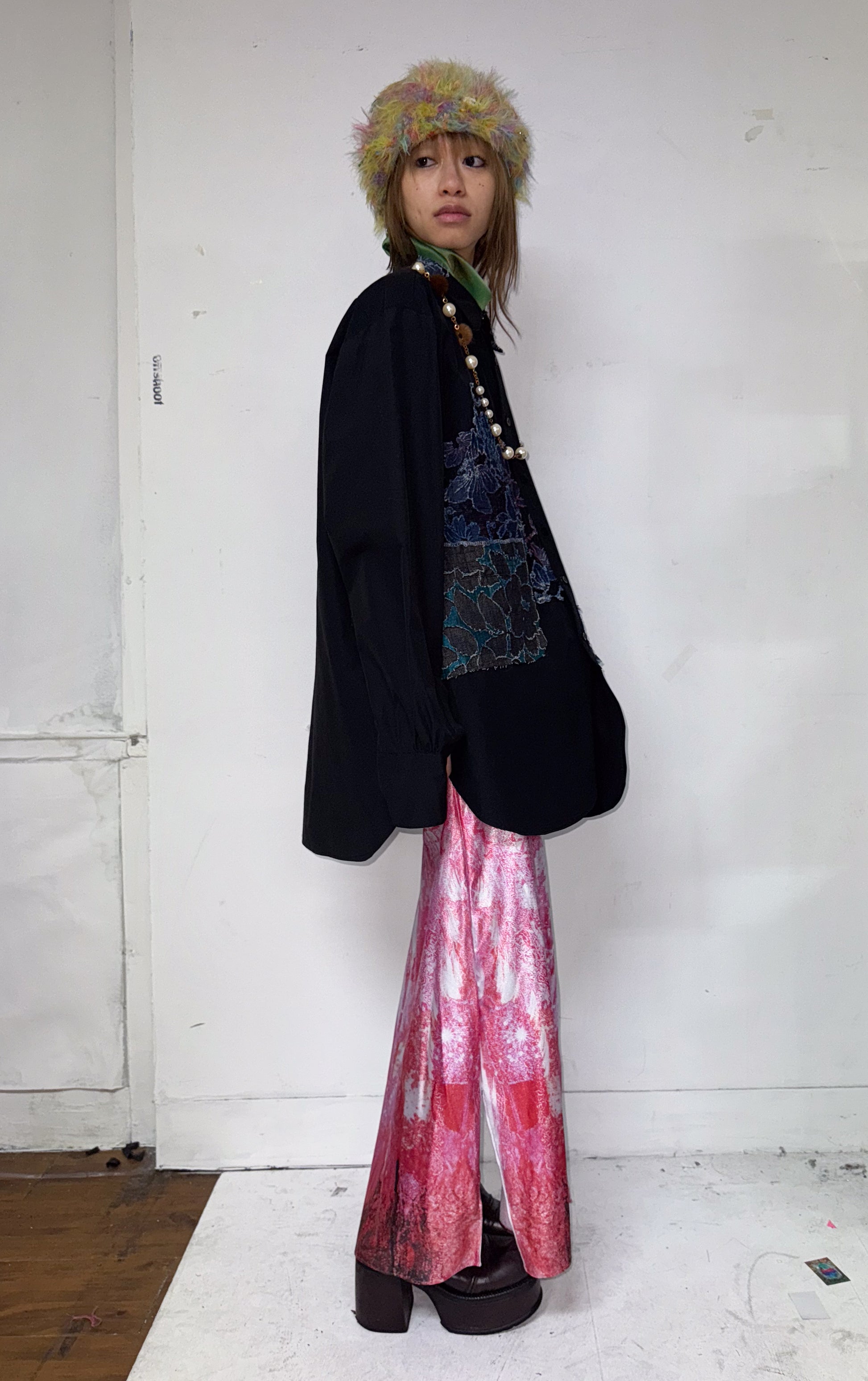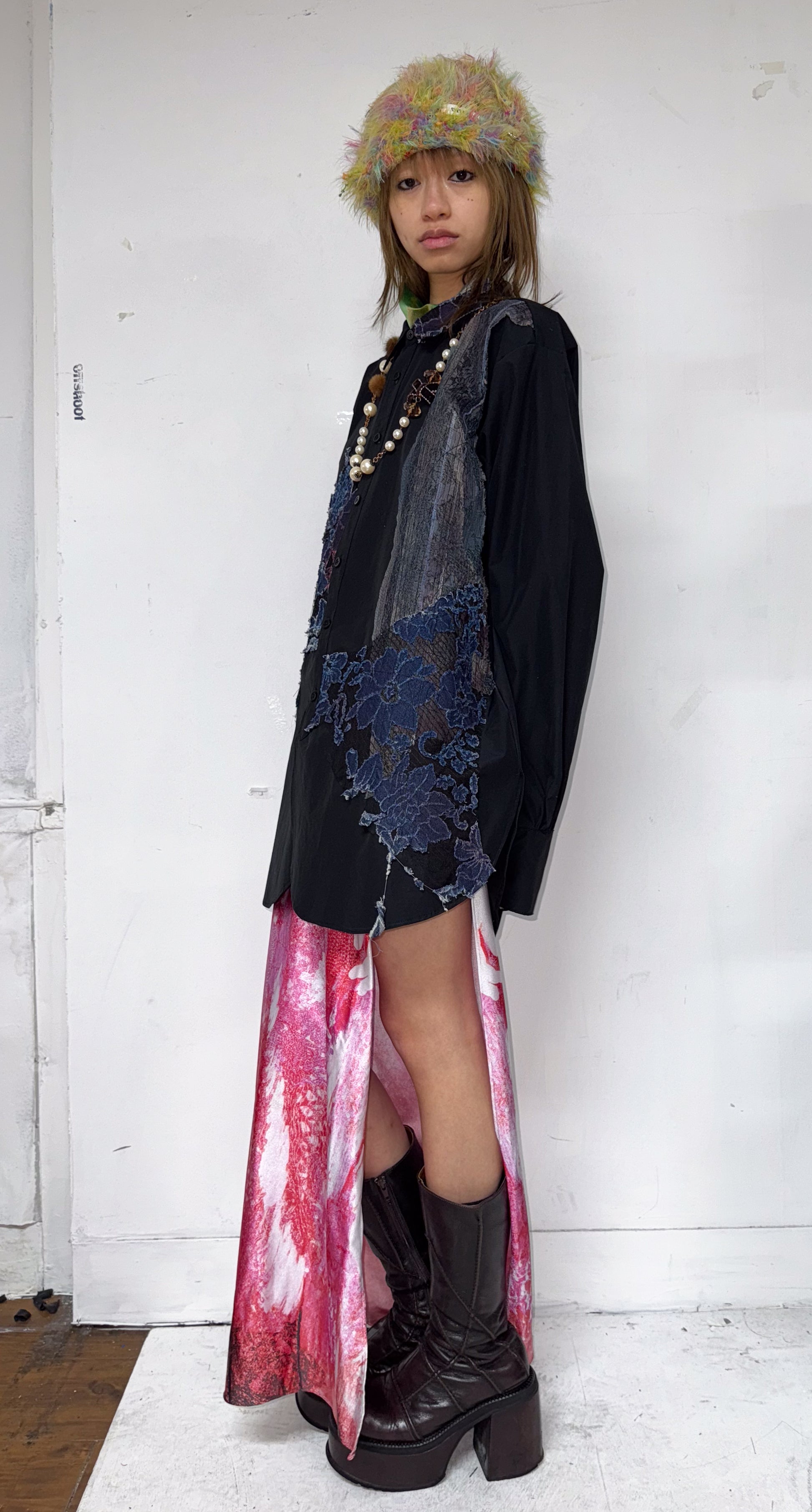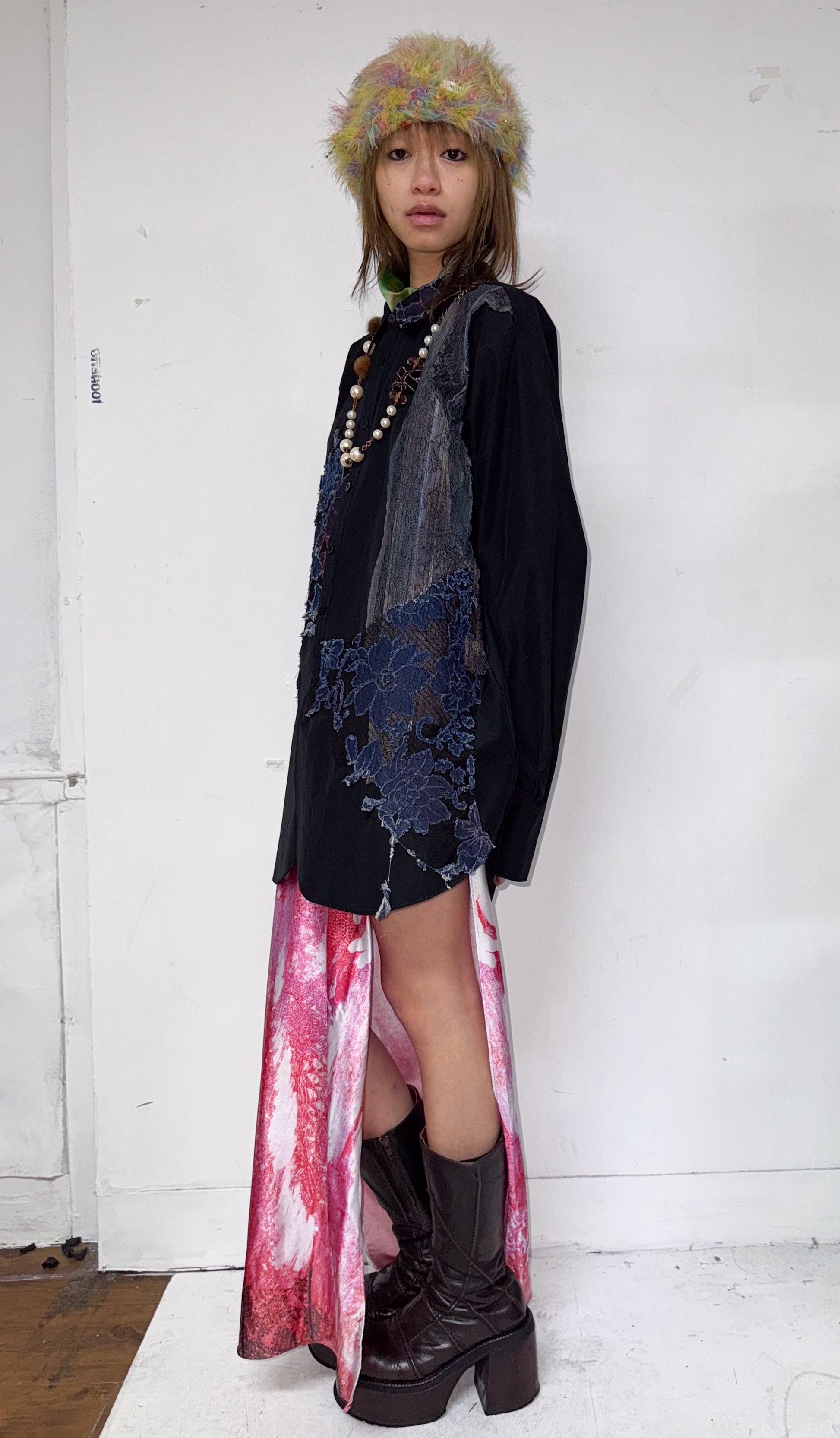 Featuring patchwork designs created with embroidery and collage spray painting techniques. Each shirt is a one-of-a-kind handmade piece.