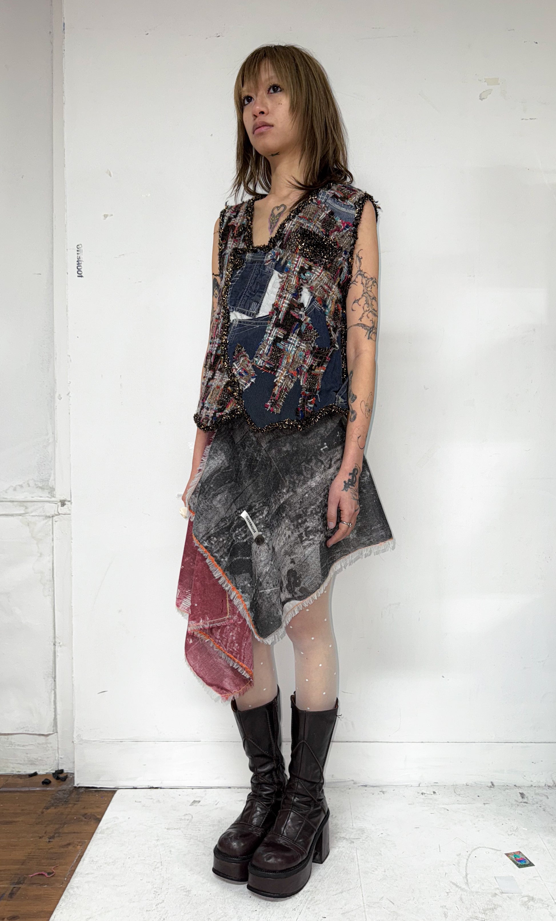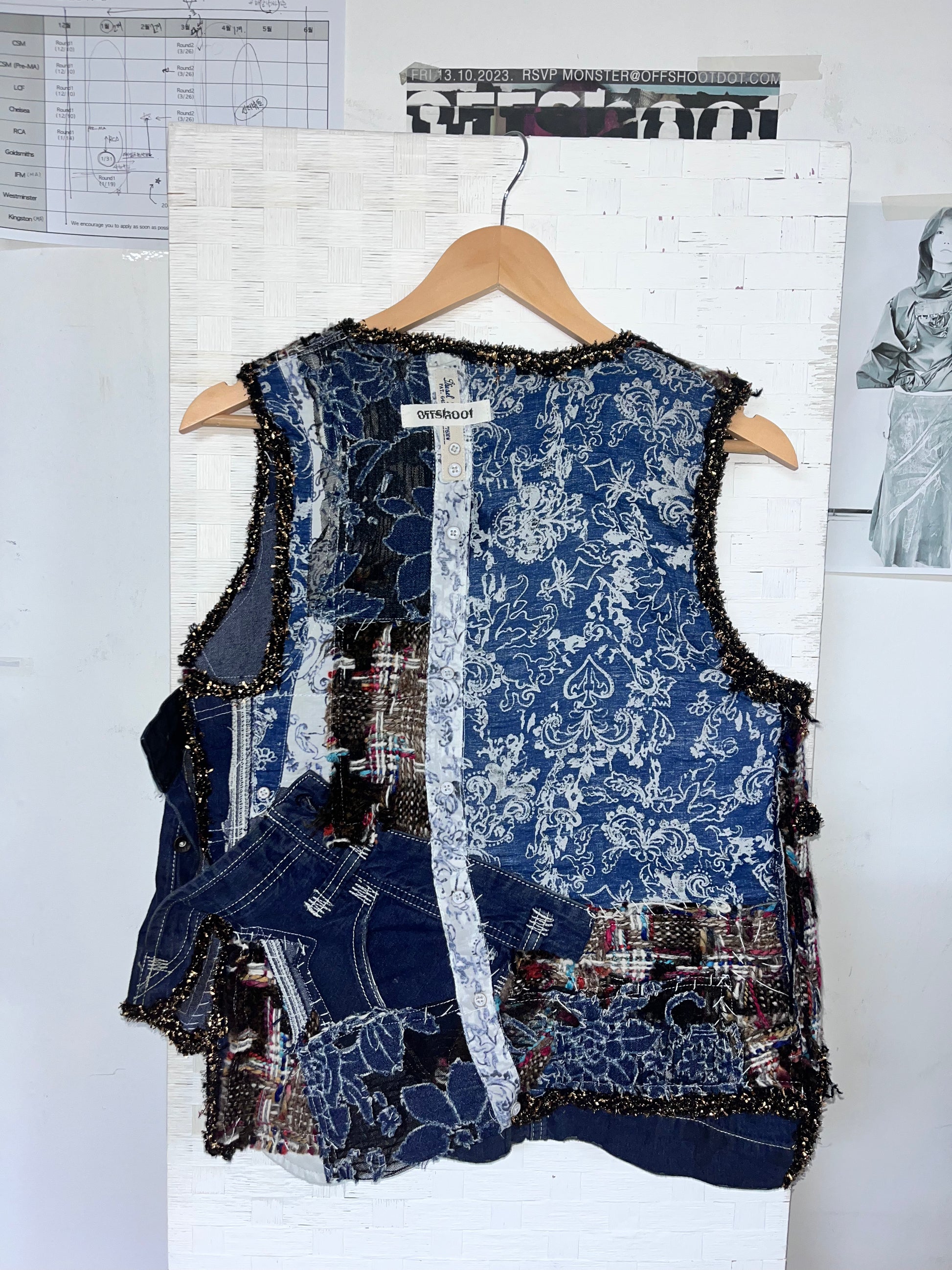 This vest is a collaged piece created through a patchwork technique using headstock materials. Each piece is crafted individually, featuring unique details and originality.